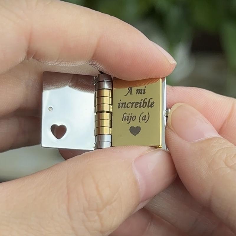 El collares un detalle pensado para motivar, inspirar y recordarle a tus hijos cuƔnto crees en ellos. Su diseƱo en forma de pequeƱo libro con mensaje grabado lo convierte en un accesorio significativo que pueden llevar a diario.