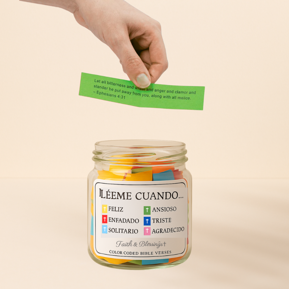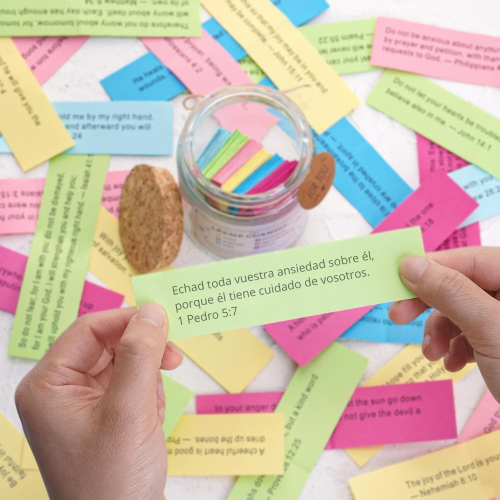 Dentro del frasco encontrarás 90 versículos bíblicos en español, organizados por colores que representan diferentes estados de ánimo, como paz, esperanza, amor, consuelo y renovación. Así puedes elegir justo el mensaje que tu corazón necesita en cada día.