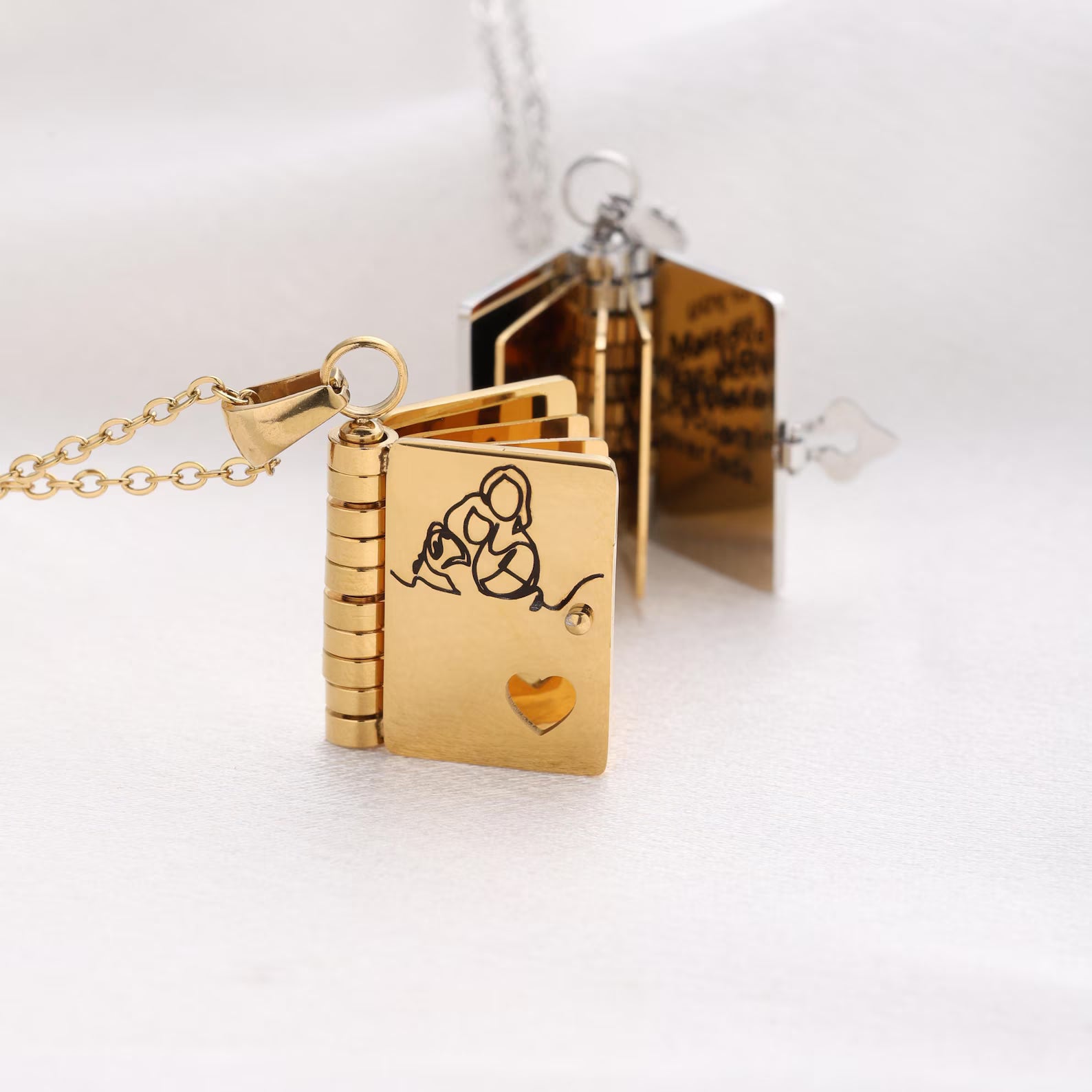Este collar con forma de libro fue creado para celebrar la fuerza, el coraje y el amor que existe entre tú y tu nieta. Es un símbolo profundo, pensado para acompañarla en cada etapa de su vida, recordándole cuánto la quieres y lo orgulloso que estás de ella. Su diseño elegante y delicado lo convierte en un regalo especial que nunca pasa desapercibido.